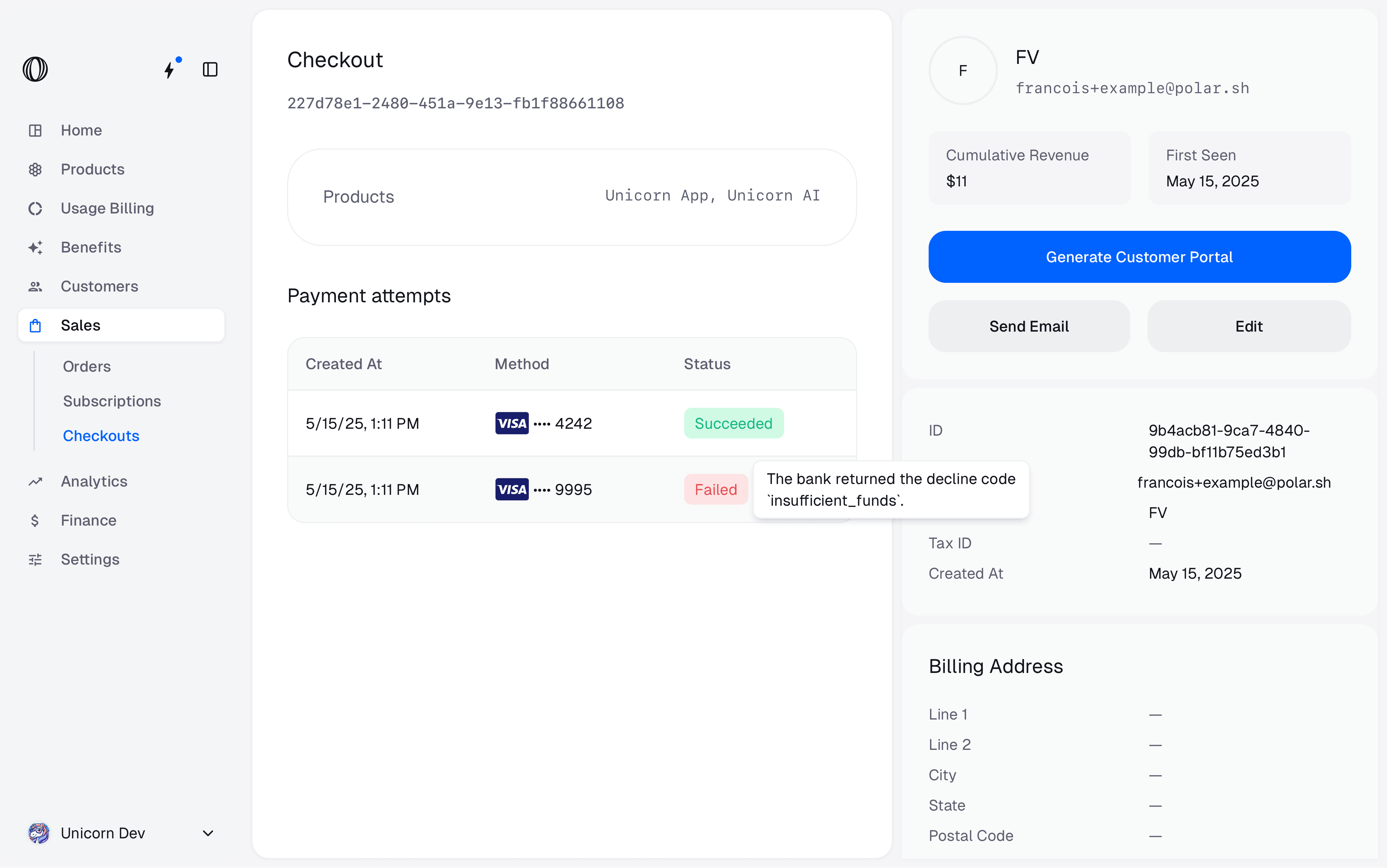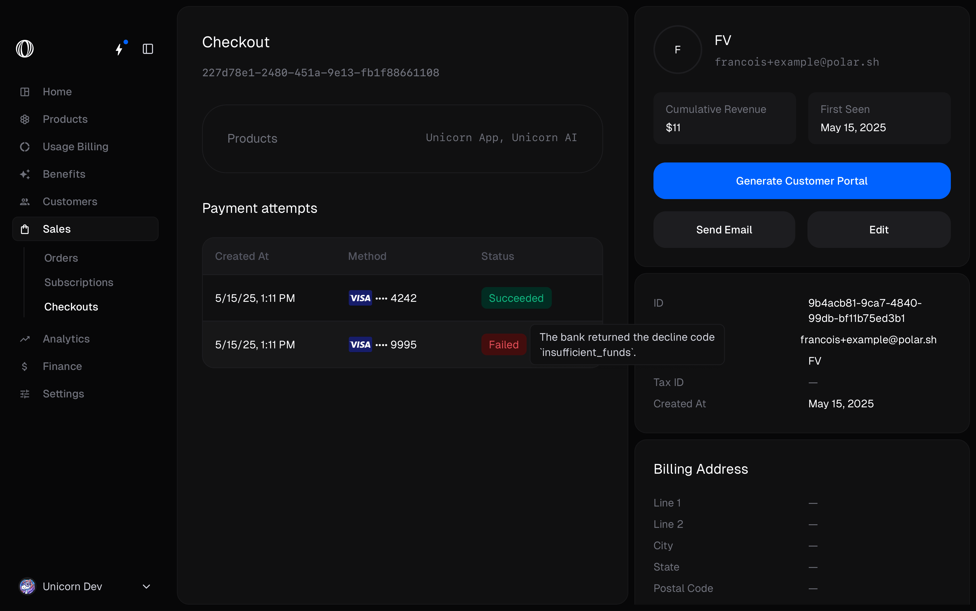We’ve added a new Checkouts tab under the Sales, where you can review all the checkout sessions, successful or not. You can filter them by customer email, status, and product. You can also see the payment attempts for each checkout session, including the reason for any failed or declined payments.