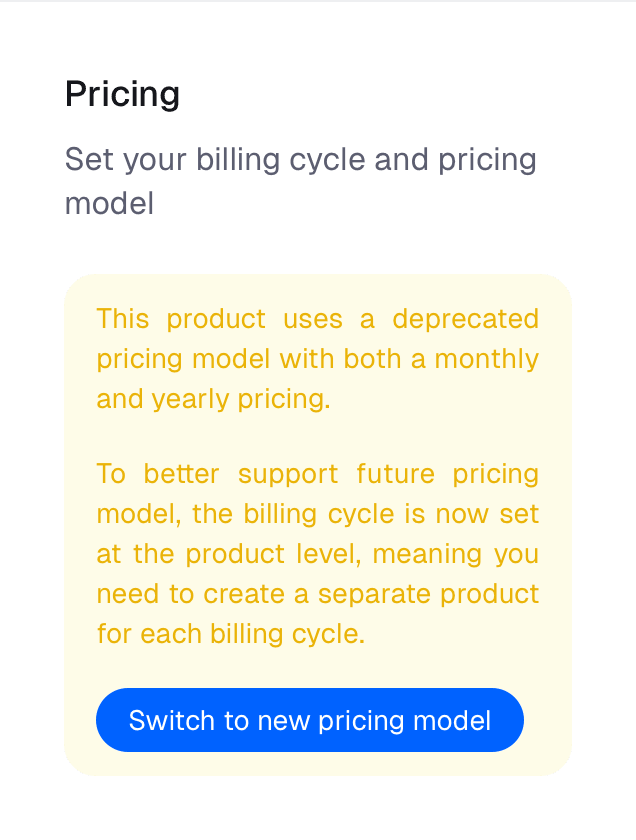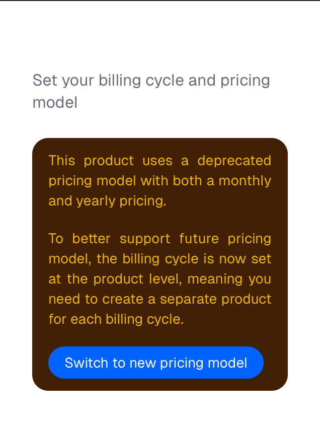 - Products can no longer have both a monthly and yearly pricing. Existing products still work, but you’ll see a warning like this when trying to edit their pricing: