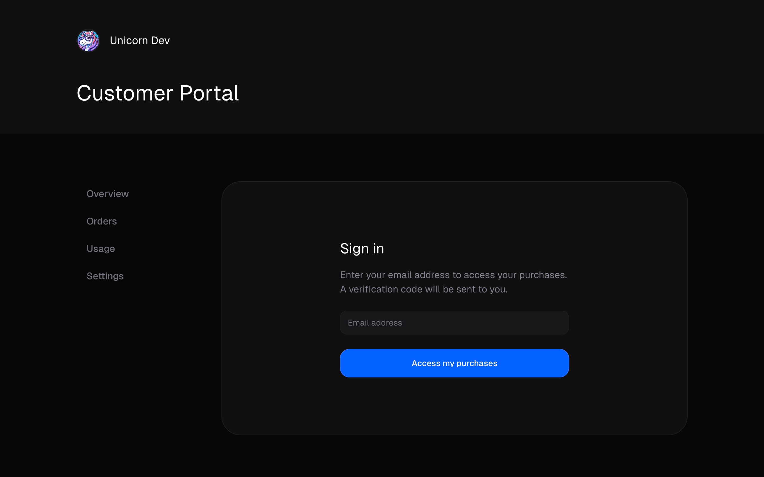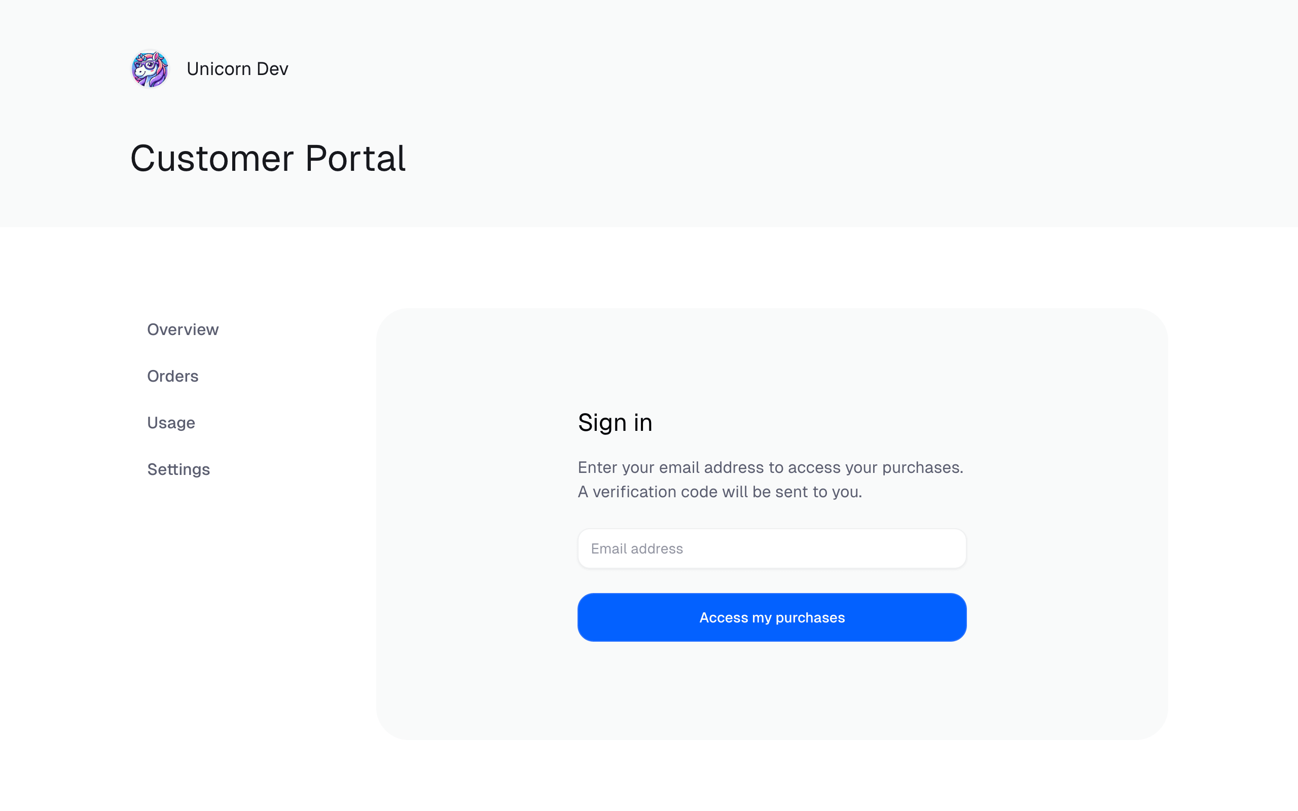 The customer portal is directly available from the URLhttps://www.spairehq.com/your-org-slug/portal. Your customers will be able to authenticate there by entering the email they used to purchase or subscribe to your products.