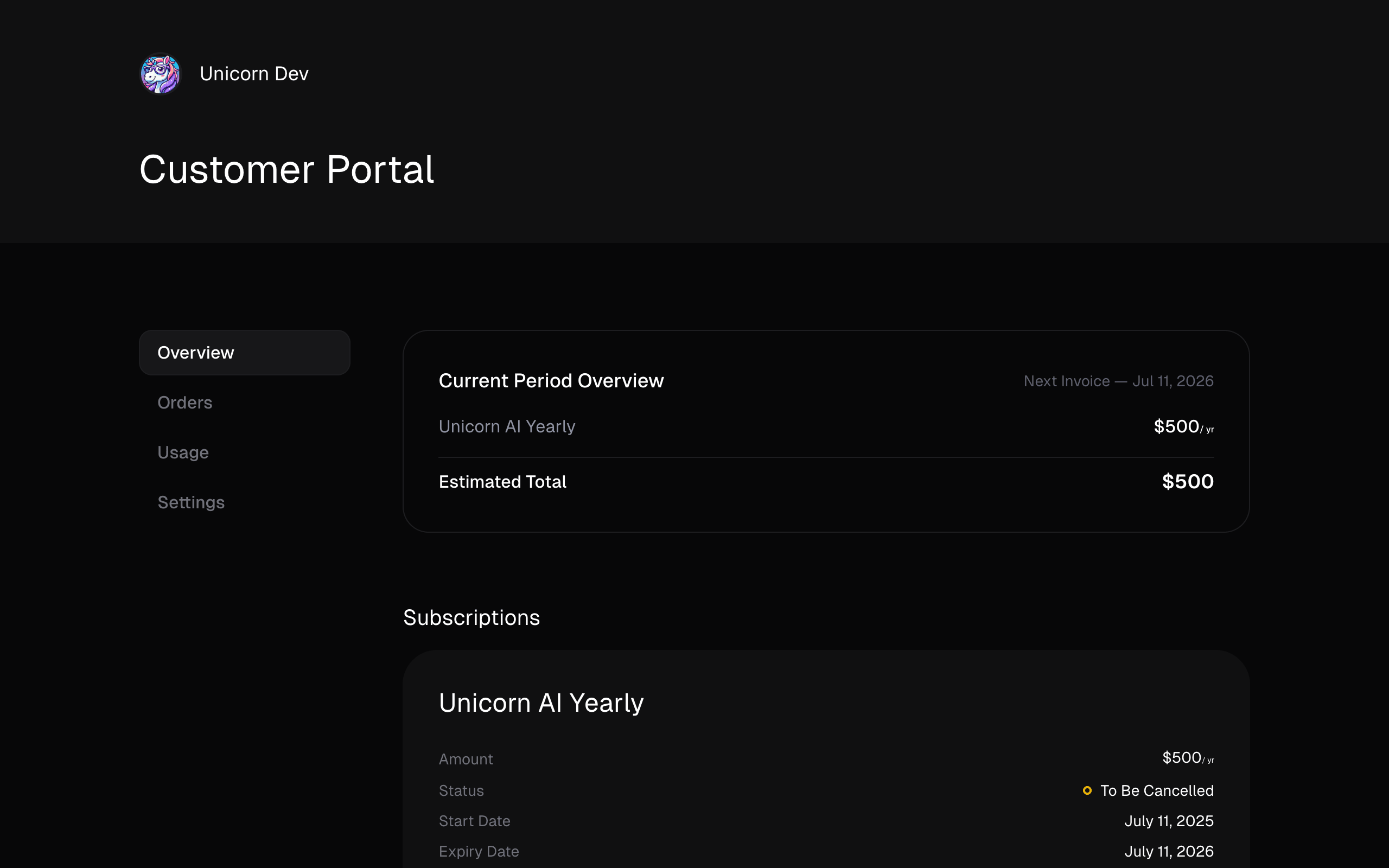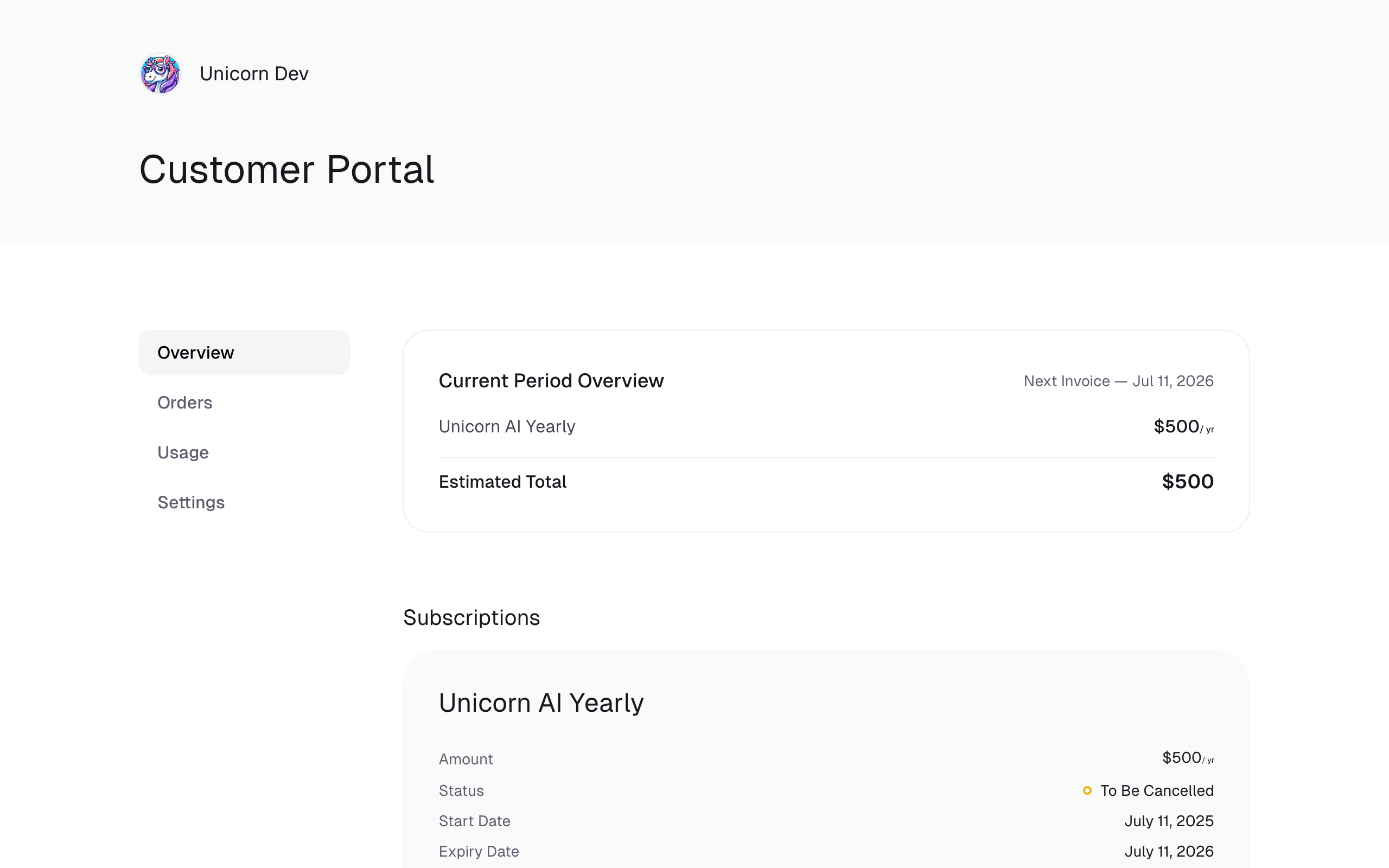 You can provide a pre-authenticated Customer Portal Link to your customers. This is handy if you want to redirect them directly from your application. Using the Spaire API, all you need is to call thecustomerSessions endpoint. Here’s an example using our TypeScript SDK.