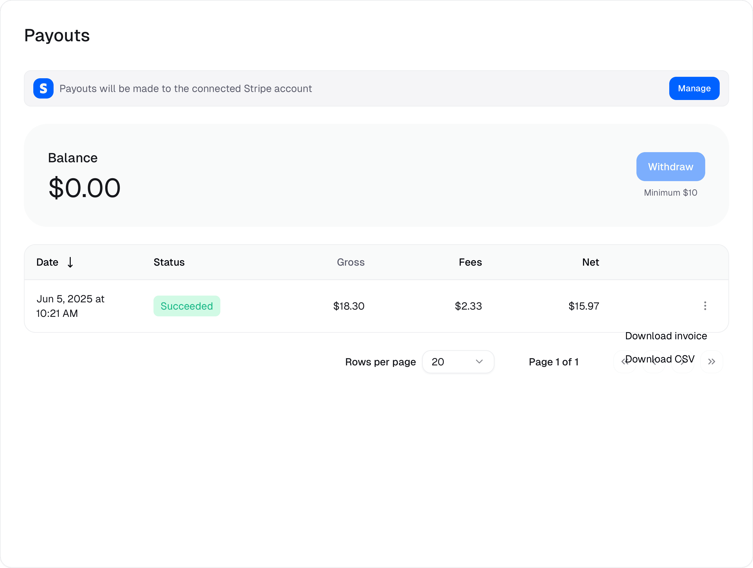 Since we’re the Merchant of Record, your customers get an invoice from Spaire. Thus, for your accounting, you need to issue an invoice to Spaire for the amount we paid out to you. To ease this process, we can automatically generate a reverse invoice for you, detailing the sells we made on your behalf, minus our fees. You can generate them from the Payouts page under Finance in your Spaire dashboard. Click on the ellipsis next to the payout you want to generate a reverse invoice for, and select Download invoice.
