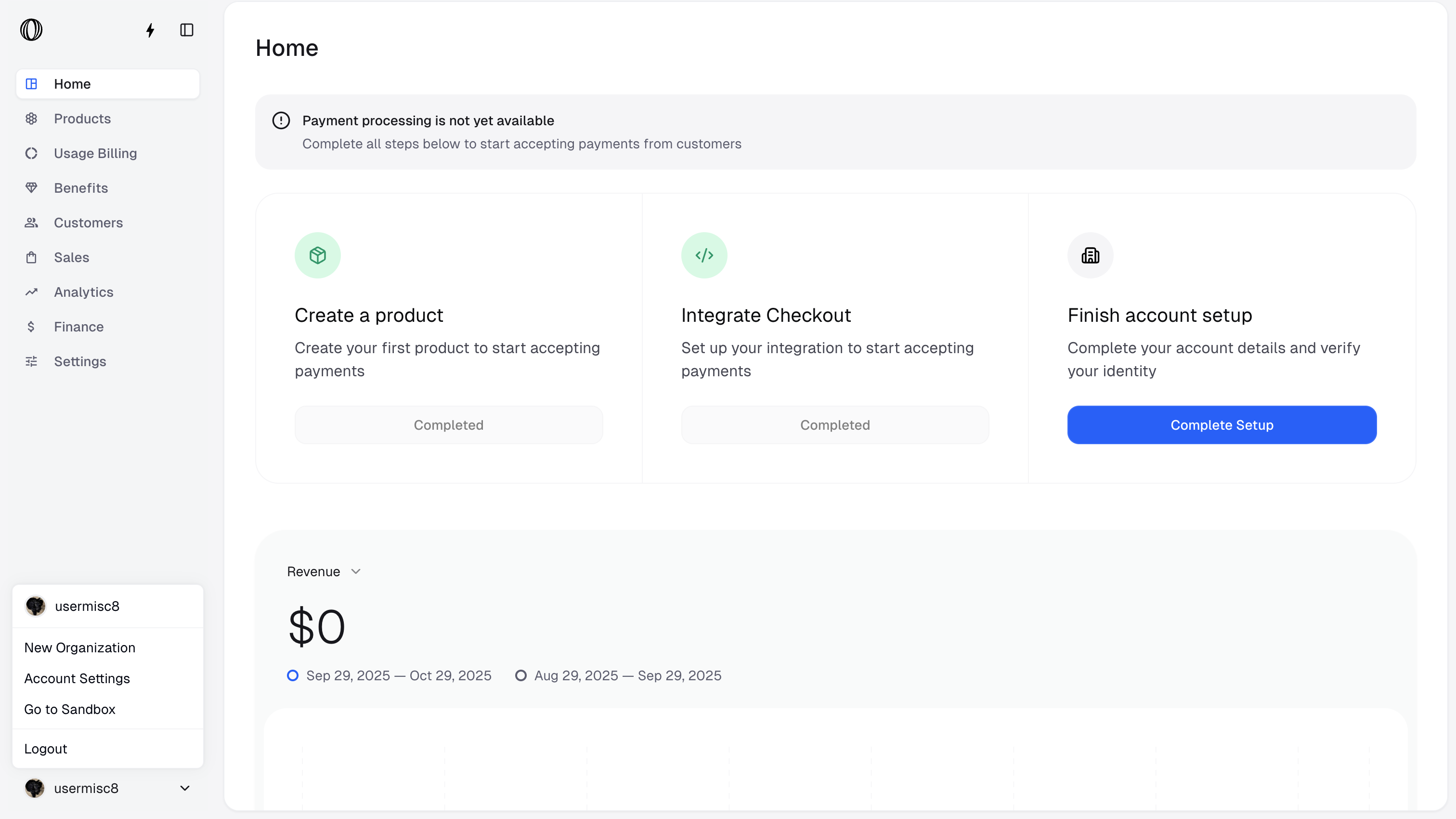 To create an organization in addition to your first organization, open the menu in the bottom left corner in the dashboard and click