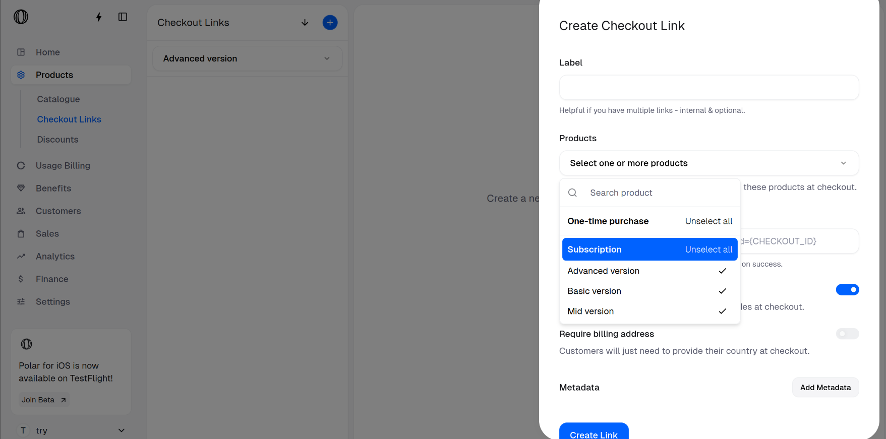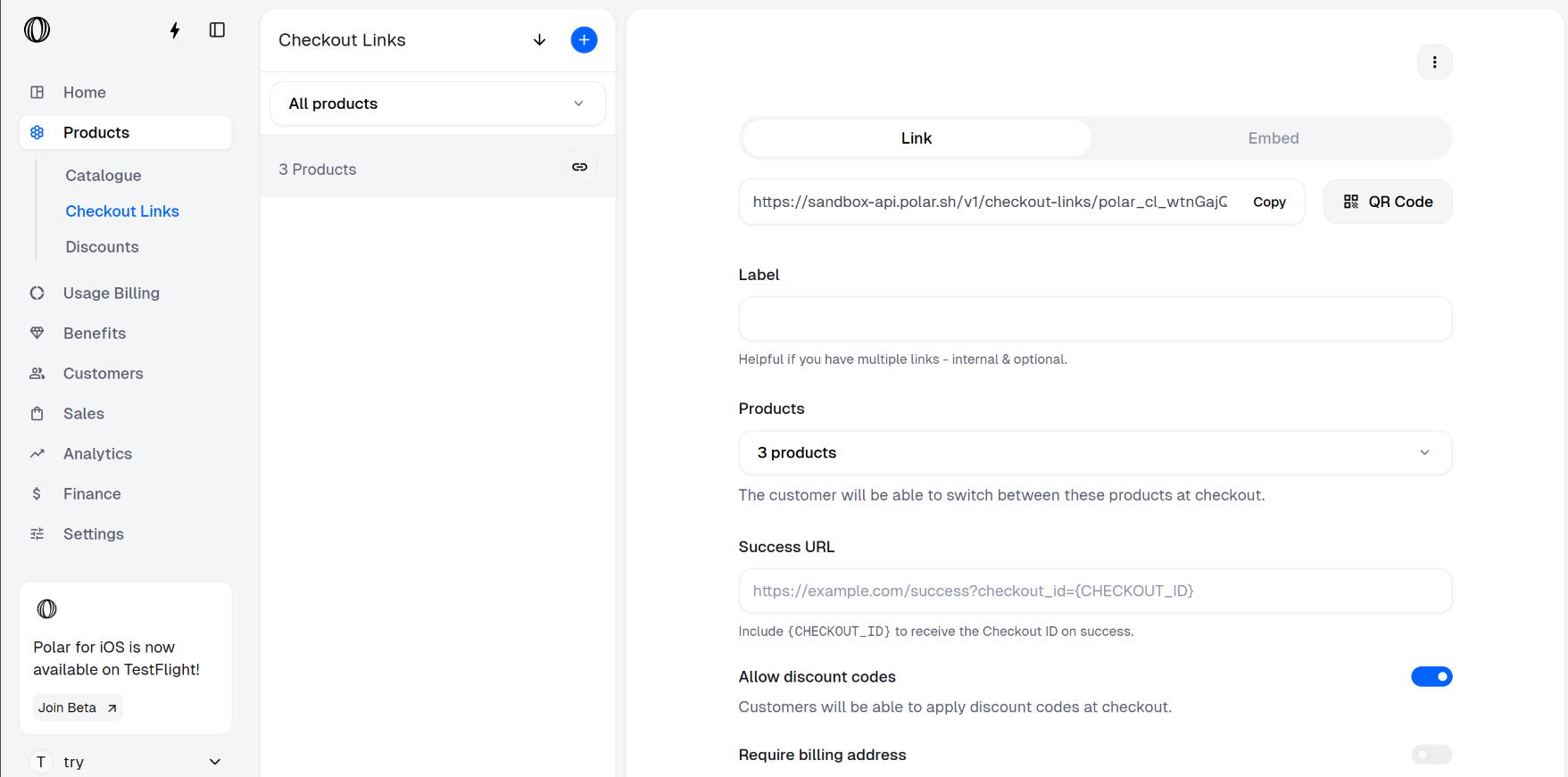 At this step, you may add a label, success URL and metadata. You may also configure whether discount codes are allowed and whether billing address is required from customers.