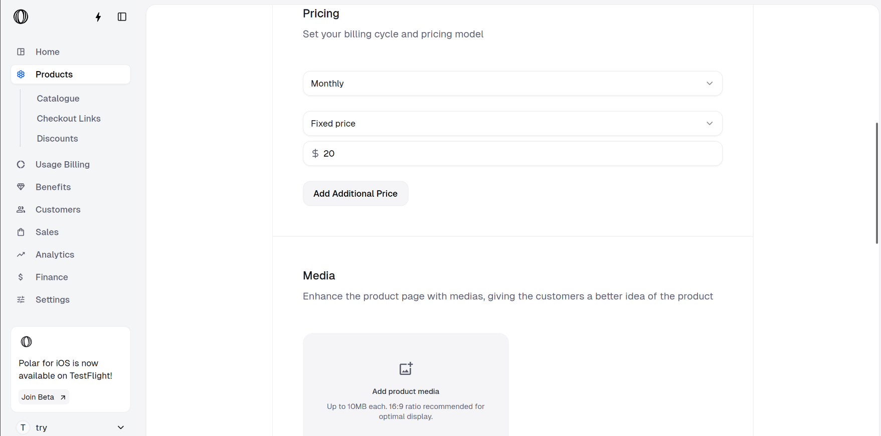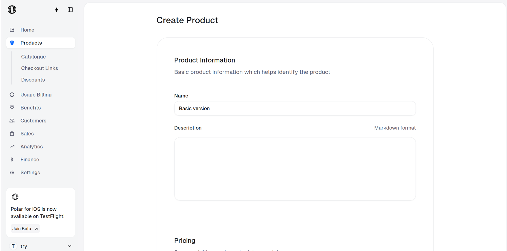 Click on New Product and fill the product information. Here, we are creating a monthly subscription product Basic version with cost $20.