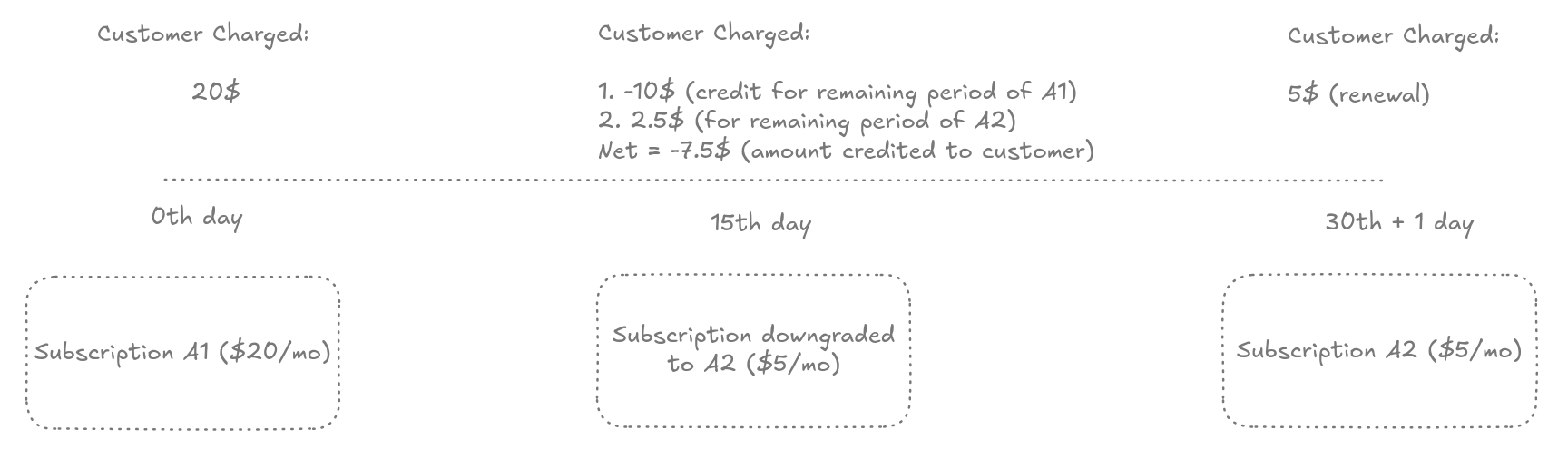 You can downgrade a subscription by following the steps outlined in Subscription Downgrades, which explains the process from both the merchant’s and the customer’s perspectives. Example 1: Proration type =invoice