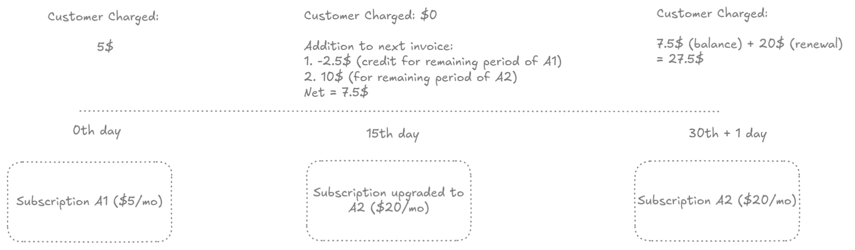 You can upgrade a subscription by following the steps outlined in Subscription Upgrades, which explains the process from both the merchant’s and the customer’s perspectives. Example 1: Proration type =invoice
