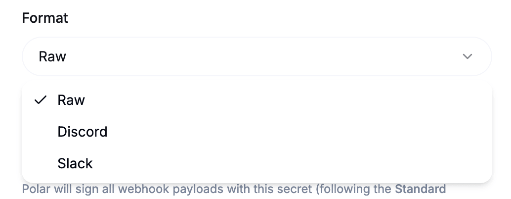 For standard, custom integrations, leave this parameter on Raw. This will send a payload in JSON format.If you wish to send notifications to a Discord or Slack channel, you can select the corresponding format here. Spaire will then adapt the payload so properly formatted messages are sent to your channel.
